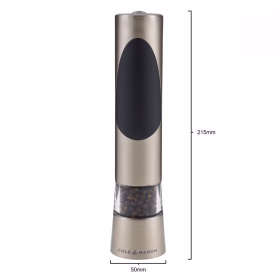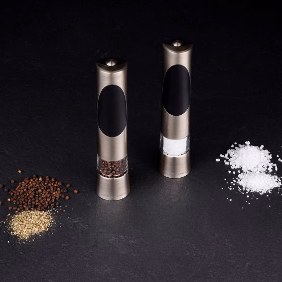 Veskid on valmistatud kõrgekvaliteedilisest akrüülist ja harjatud kroomist. Ideaalne kööki või söögilauale. Töötab ühe nupuvajutusega. Reguleeritav jahvatuse mehhanism. Veskite täitmiseks keerake akrüülist keskosa ja harjatud kroomitud ülaosa, nii et tabaluku sümbol joondub avamise sümboliga. Veski töötab 6 x AAA patareidega (ei kuulu komplekti). Mõõdud: kõrgus 215 mm, läbimõõt 50 mm